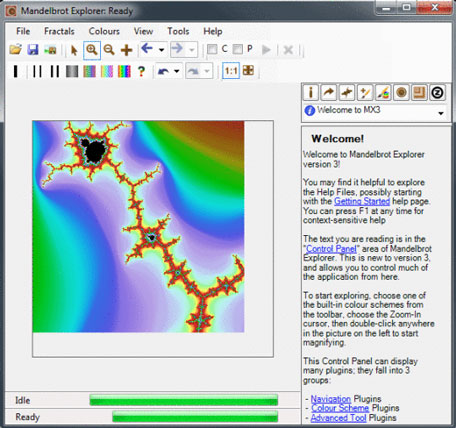 Phần mềm Mandelbrot and Julia cho phép bạn có thể phóng to các khu vực của Mandelbrot Set và hệ thống của Julia Sets. Bạn có thẻ sử dụng chuột đế khám phá bằng mắt thường một cách đơn giản hoặc bạn có thể tinh chỉnh các khu vực bạn nhìn thấy bằng một trong những chương trình nhúng Navigation. Các hình ảnh được đưa ra là ảnh màu dù bạn sử dụng một trong những bảng màu tiêu chuẩn hay bằng cách tạo ra bảng màu của riêng mình sử dụng công cụ tạo màu. Các file tham số và hình ảnh kết quả có thể lưu vào đĩa. Bạn cũng có thể lưu lại toàn bộ các chuỗi hình ảnh sử dụng công cụ zoom. Mandelbrot Explorer có thể cài đặt để phóng đại các chi tiết một cách ngẫu nhiên hoặc chọn khu vực cần phóng đại để thêm thú vị.